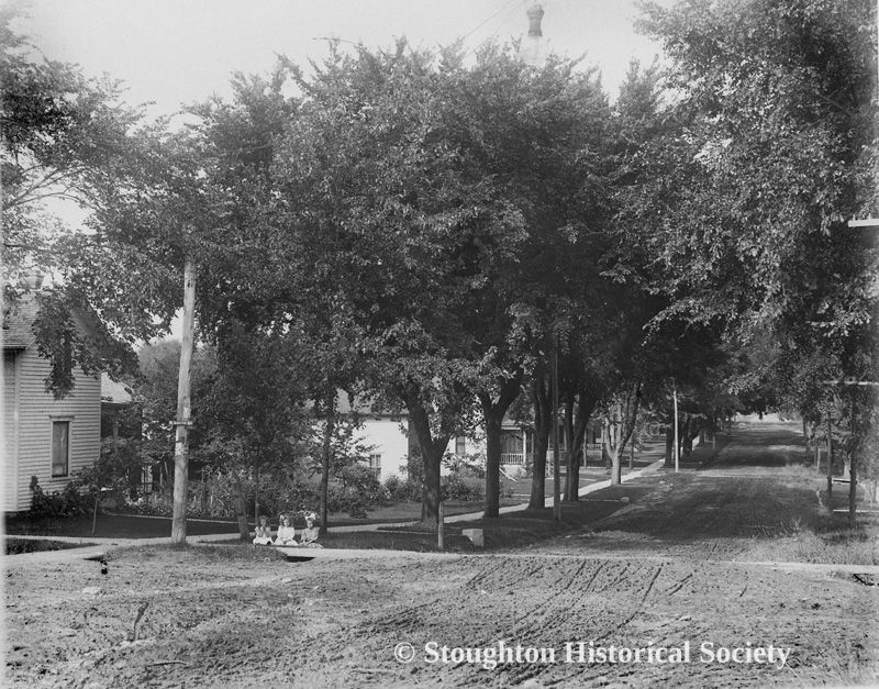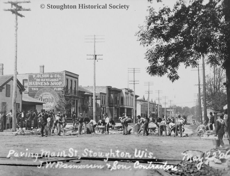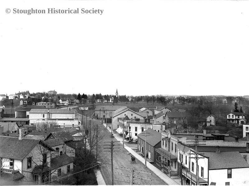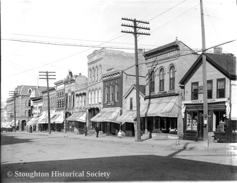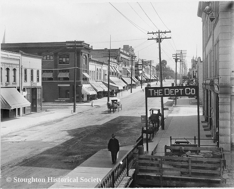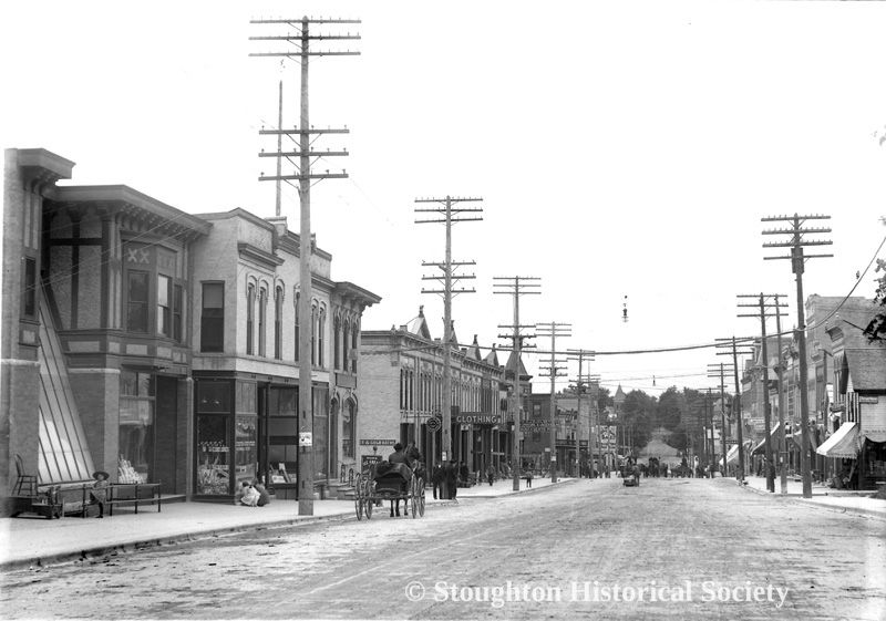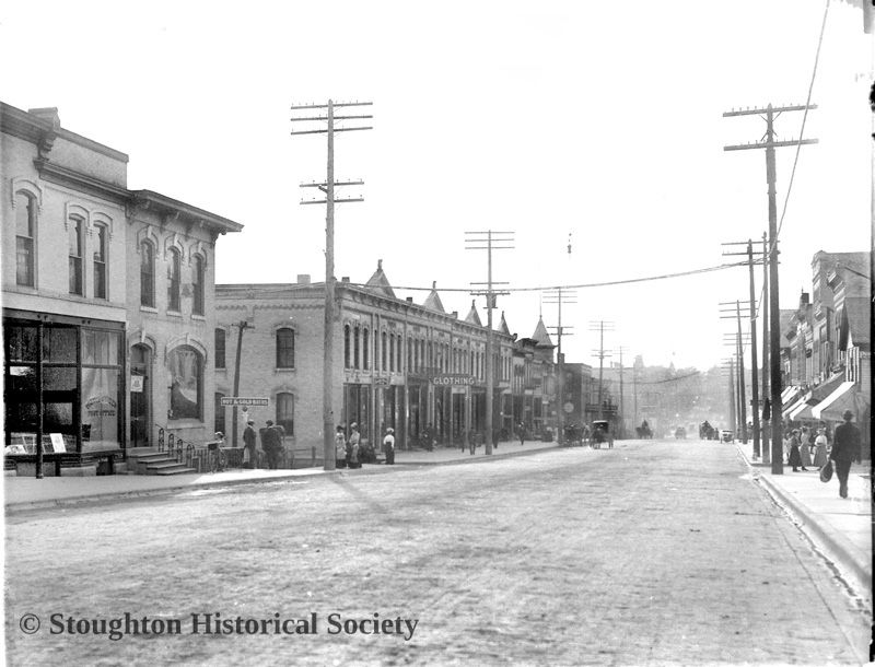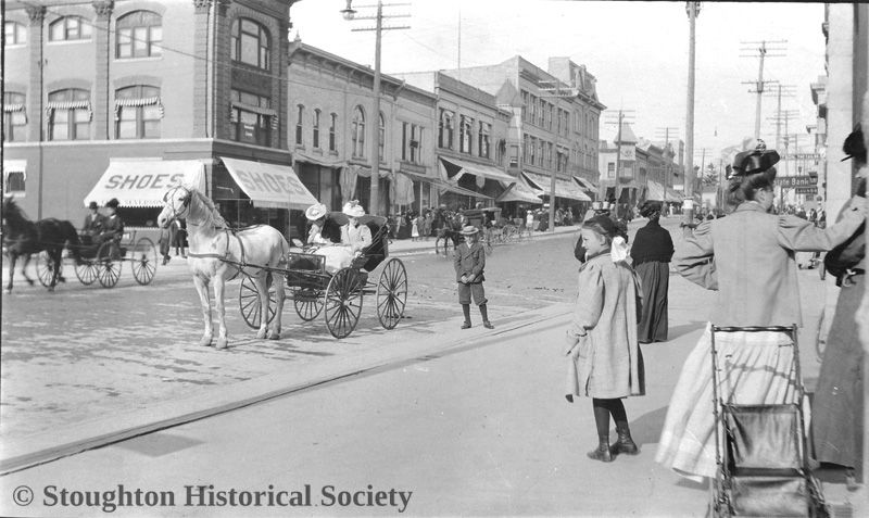Curator@HistoricStoughton.org | April 3, 2023Photo appears to be from 1907. Based on the buildings that are present, the newly paved street, and the sign on the Hyland-Olson building that reads "Our 10th A...." It's likely that this sign is advertising the 10th anniversary of the building (built in 1897).DSCF0558 web DSCF0558 web
